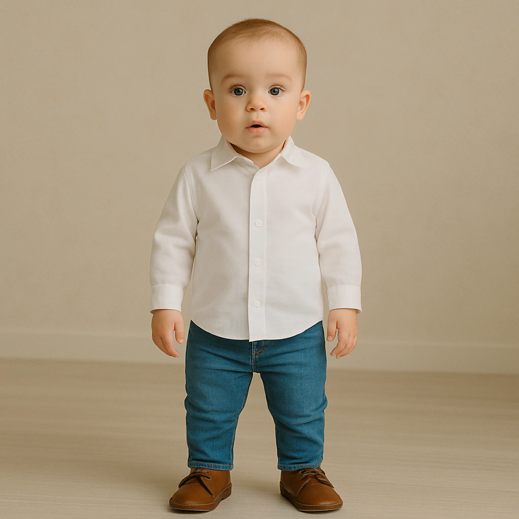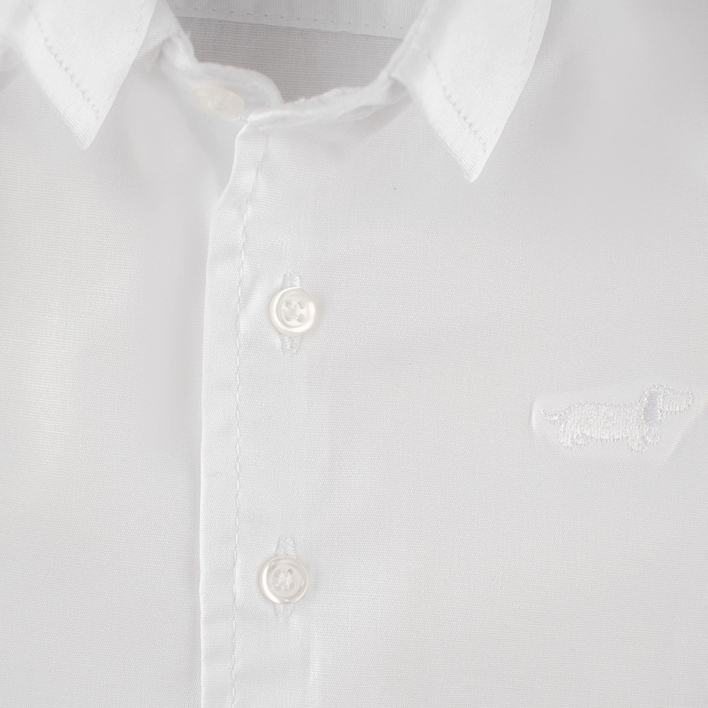 Características Principais: Elegância e conforto em perfeita harmonia! Esta camisa infantil de manga longa é confeccionada em algodão com um leve toque de elastano, garantindo liberdade de movimento para os pequenos. Possui fecho frontal com botões brancos e um bordado delicado de cachorrinho no lado esquerdo do peito, na mesma cor da peça — discreto e encantador.