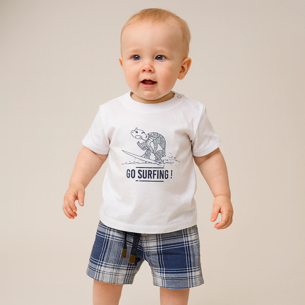 Características Principais: Um look encantador que une charme e conforto! A bermuda xadrez em sarja traz um toque clássico e moderno, com cintura ajustável em elástico e cadarço com detalhe em couro para mais estilo. Os bolsos garantem praticidade, enquanto a camiseta de algodão com estampa divertida completa o visual com alegria e leveza. Um conjunto feito para deixar os pequenos ainda mais fofos e confortáveis em qualquer ocasião.