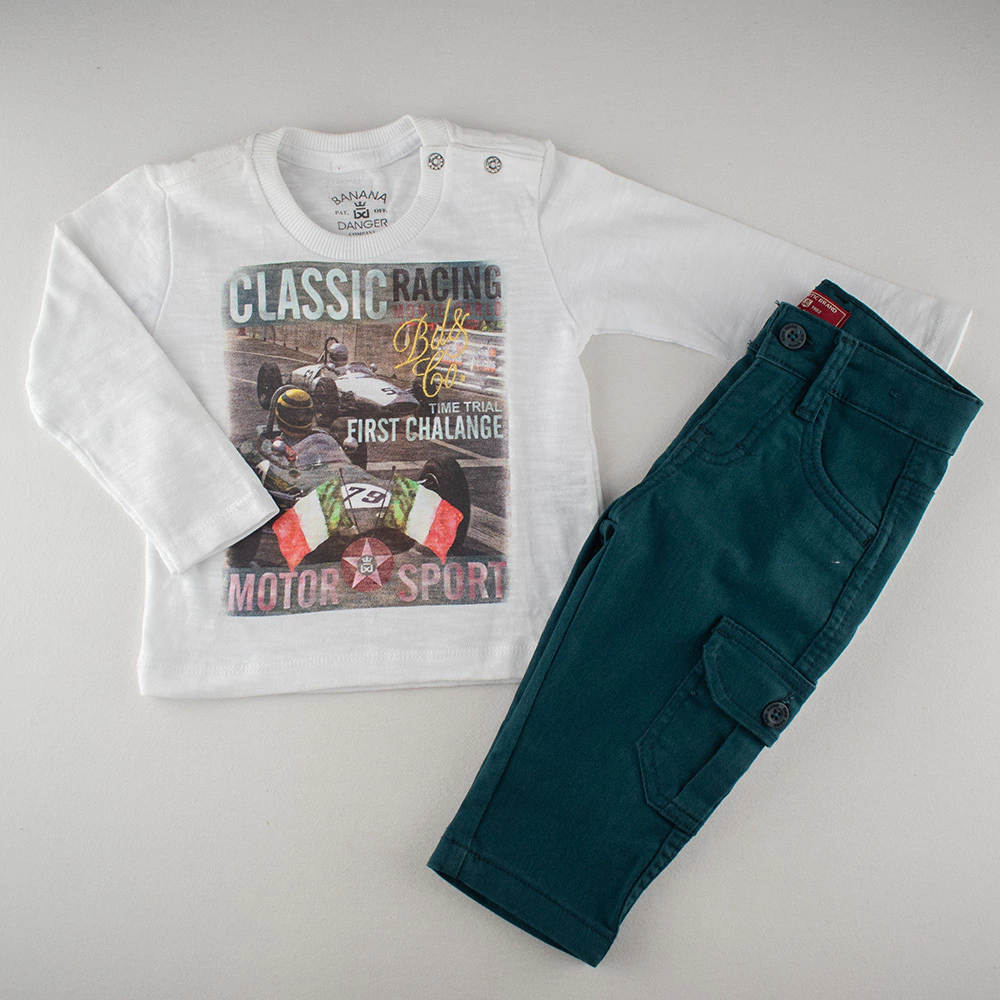 Características Principais: Conjunto estiloso e confortável composto por camiseta manga longa com estampa de dois carros de corrida em uma pista, gola redonda com acabamento em ribana e fechamento por dois botões no lado esquerdo para facilitar na hora de vestir. Acompanha calça jeans tingida na cor verde escuro, com quatro bolsos frontais, dois bolsos traseiros com botão, passadores para cinto, fecho de botão e zíper, além de elástico interno com regulagem na cintura para melhor ajuste.