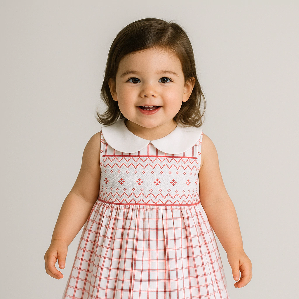 Características Principais: Vestido rodado e encantador, confeccionado em tecido xadrez largo e sem mangas, com gola boneca lisa e acabamento em viés no mesmo xadrez. Possui delicado bordado casinha de abelha com zig zag e bolinhas que lembram cerejinhas, além de faixa na cintura que forma um gracioso laço nas costas. O forro é liso com barrado de rendinha, proporcionando mais conforto e charme. Acompanha laço médio com bico de pato na mesma estampa do vestido e, nos tamanhos do M ao 1, tapa fraldas combinando.